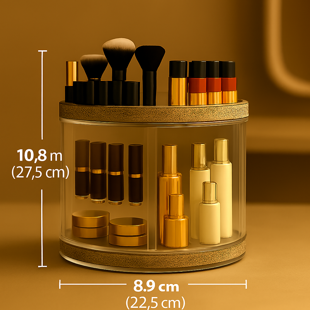 Con 27,5 cm de alto y 22,5 cm de diámetro, es perfecto para mantener tus cosméticos visibles, organizados y siempre al alcance. Ideal para quienes valoran la estética sin sacrificar la funcionalidad. ¡Convierte tu espacio en un rincón de belleza profesional!